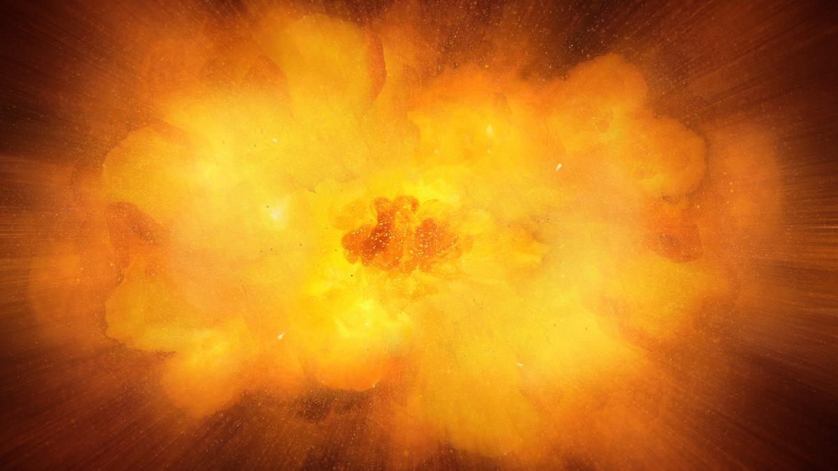 Huge realistic hot dynamic explosion, orange color with sparks and hot smoke