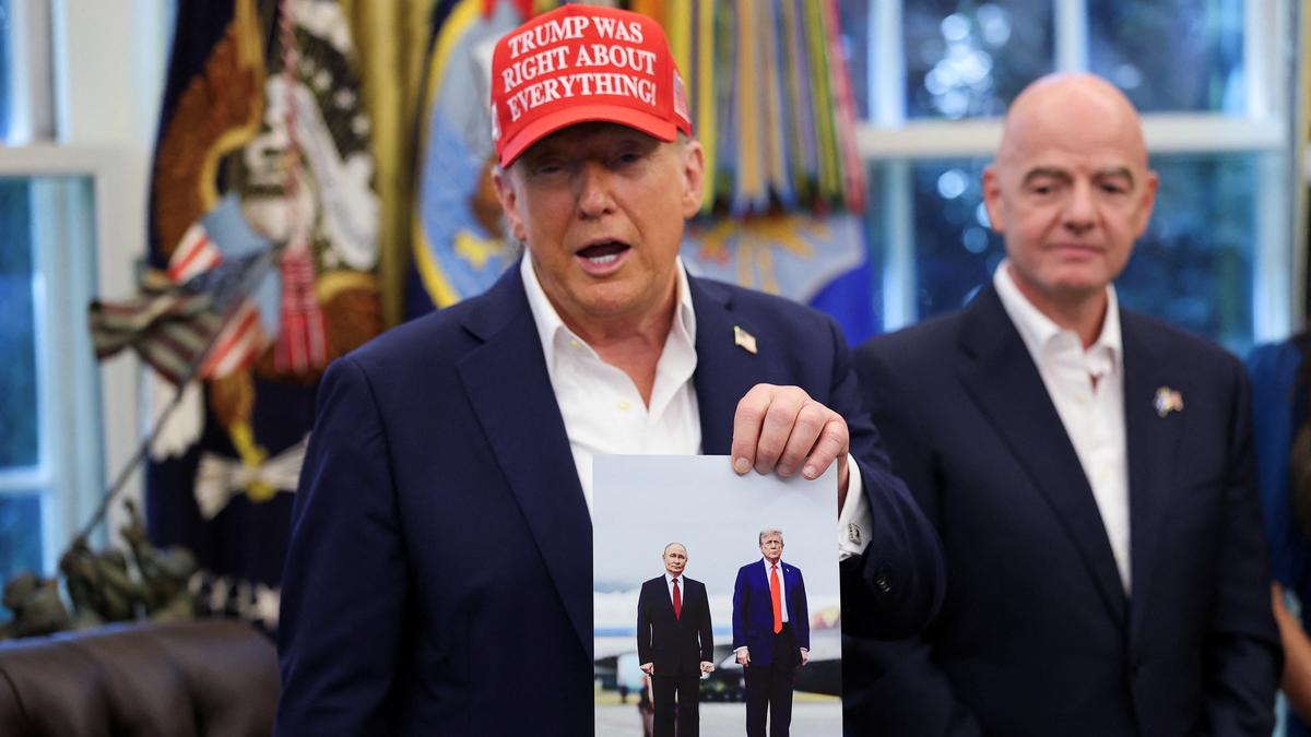 U.S. President Donald Trump holds an image of him and Russian President Vladimir Putin from their meeting in Alaska, as FIFA president Gianni Infantino stands, as President Trump makes an announcement on the 2026 FIFA World Cup, in the Oval Office at the White House in Washington, D.C., U.S., August 22, 2025.