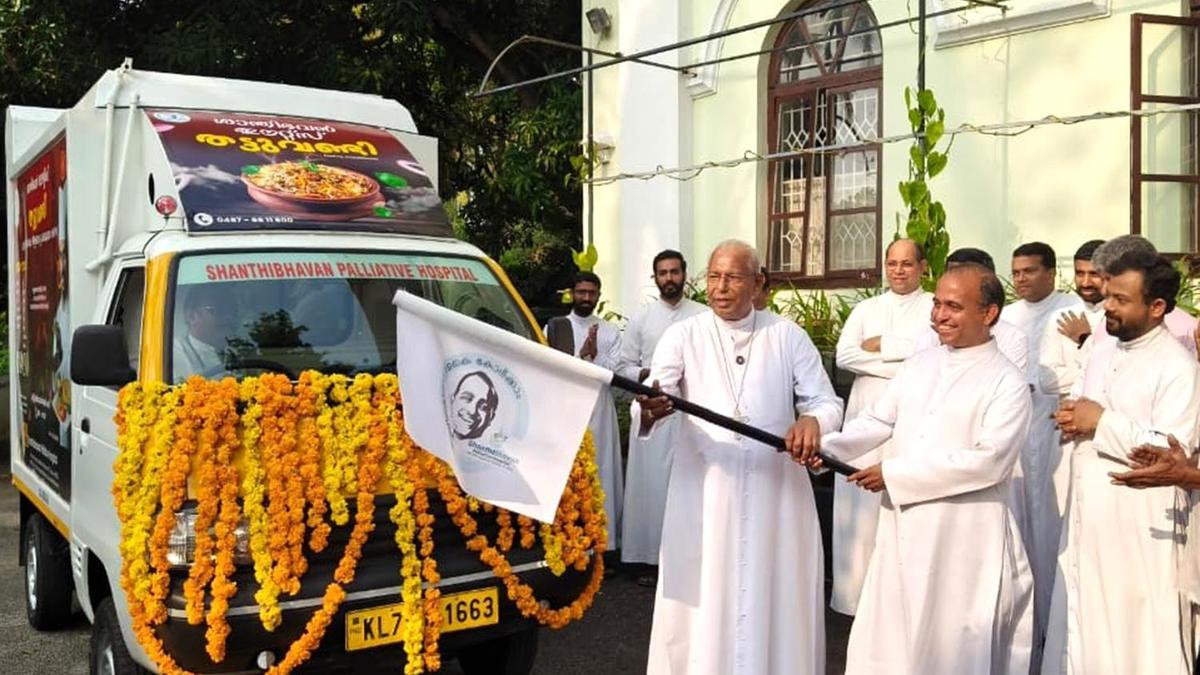 Thrissur Archbishop Mar Andrews Thazhath flags off the Shanthibhavan Eats food cart, launched under the leadership of Shanthibhavan Palliative Hospital to provide affordable, quality meals amid the LPG shortage.