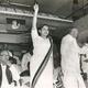 Janaki Ramachandran handing over to P.U. Shanmugham, then Health Minister, a statement announcing her decision to become the Chief Minister, on December 31, 1987. Also seen is R.M. Veerappan (seated on her right), Local Administration Minister.