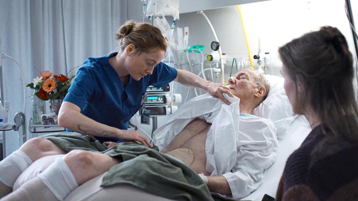 The film unfolds through a chain reaction of ordinary tasks that gradually become overwhelming. Twenty-six patients require attention, and the ward operates with two nurses and a trainee who still hesitates before every decision. One elderly man waits for a cancer diagnosis that a doctor has no time to deliver. A dying woman’s sons hover in the corridor, demanding updates. A young mother with cancer wonders whether treatment still holds meaning. A businessman in a private room calculates his hospital fees in the currency of prompt service and grows irritated when his tea arrives late. Benesch’s Floria moves from room to room, absorbing each request while supervising the nervous student nurse, Amelie. The script rarely pauses to reflect on emotions because the pressure and stress of the work are relentless. So a lullaby sung to calm a confused woman with dementia delays the next task, and a brief conversation about dog photographs offers a lonely patient a moment of human attention — each small act of kindness costs a few minutes, and those minutes accumulate until the ward begins to outrun the people trying to hold it together.