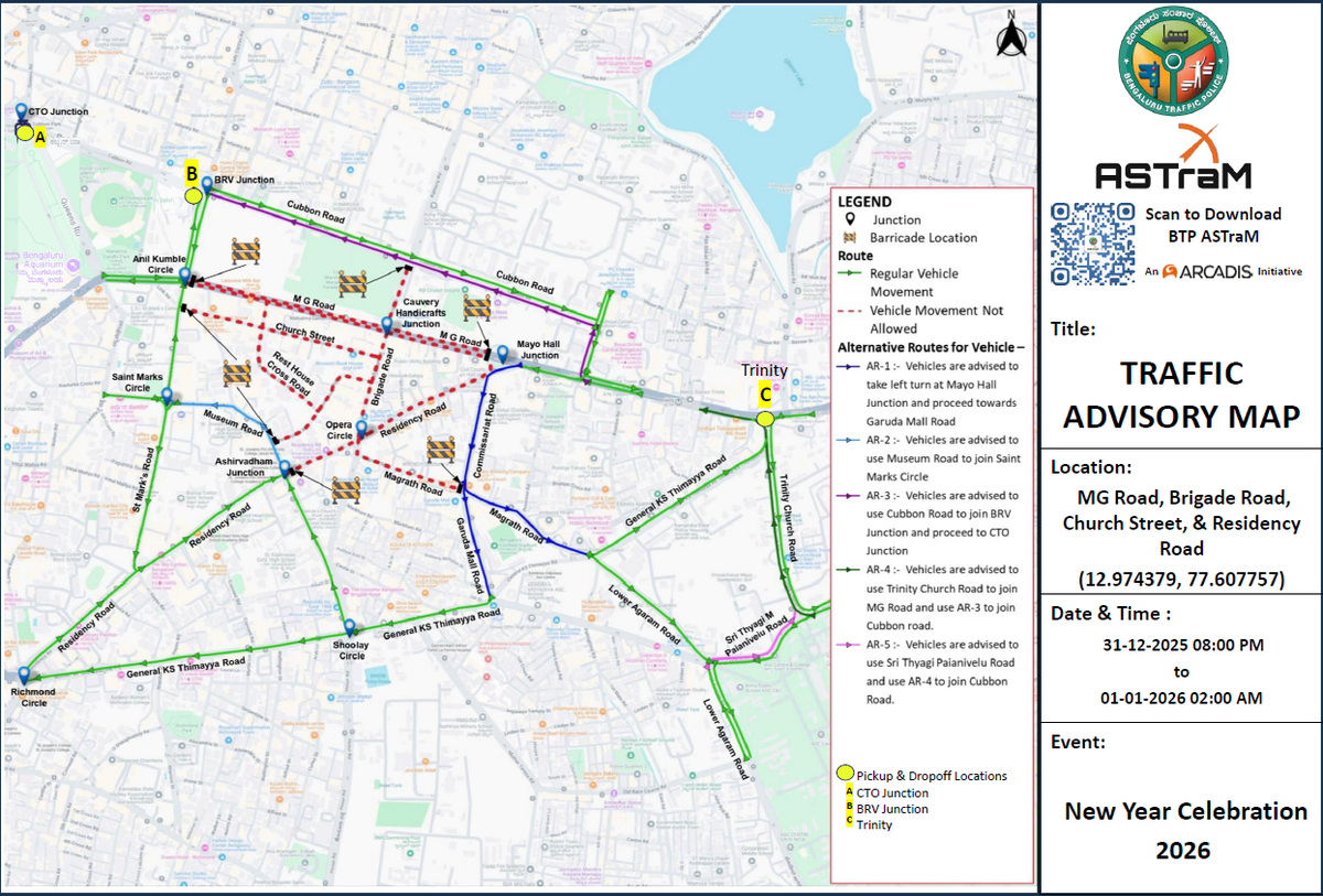 Even as Bengaluru gears up to ring in the New Year 2026, the city traffic police have issued several restrictions and diversions to streamline the massive crowd expected to participate in the New Year’s Eve revelry and avoid any untoward incidents.