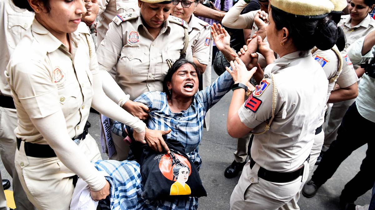 Police personnel detain student union members protesting against the death of a student by self-immolation. File