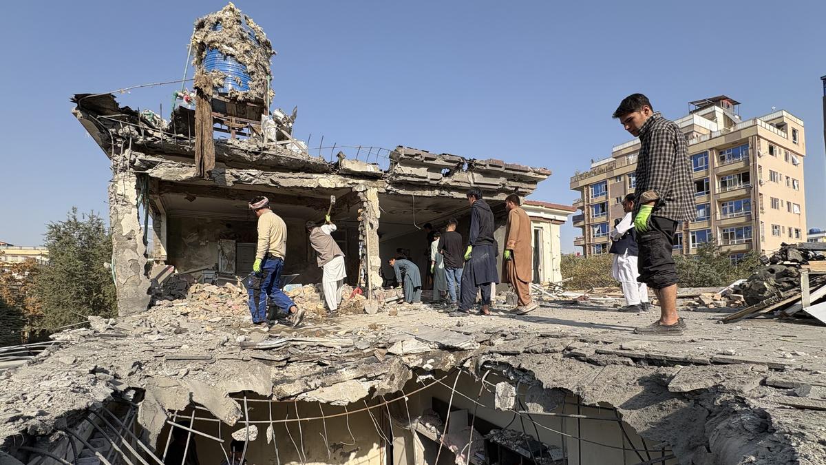 Residents remove debris from a house damaged by Wednesday’s two drone strikes, in Kabul, Afghanistan, on October 16, 2025