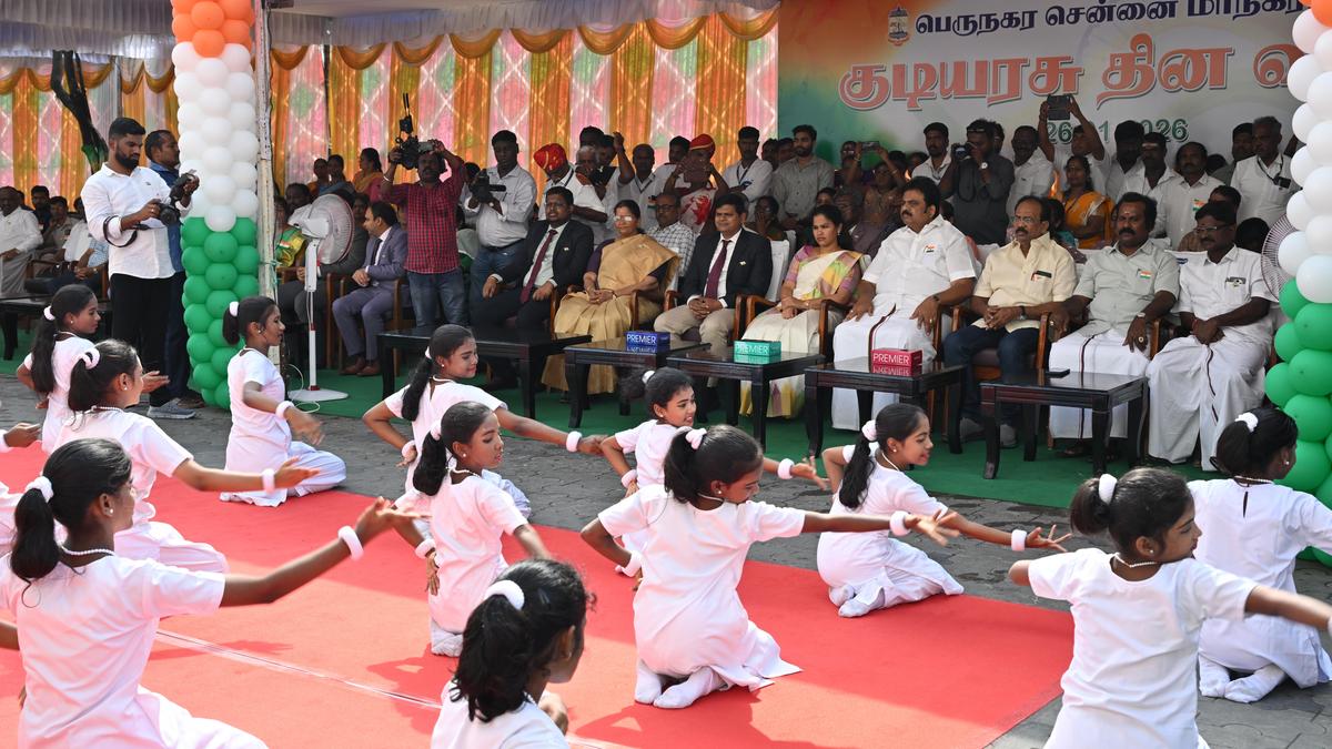 Chennai Mayor R. Priya watching a performance by students at the 77th Republic Day celebration in the Ripon Buildings on Monday.