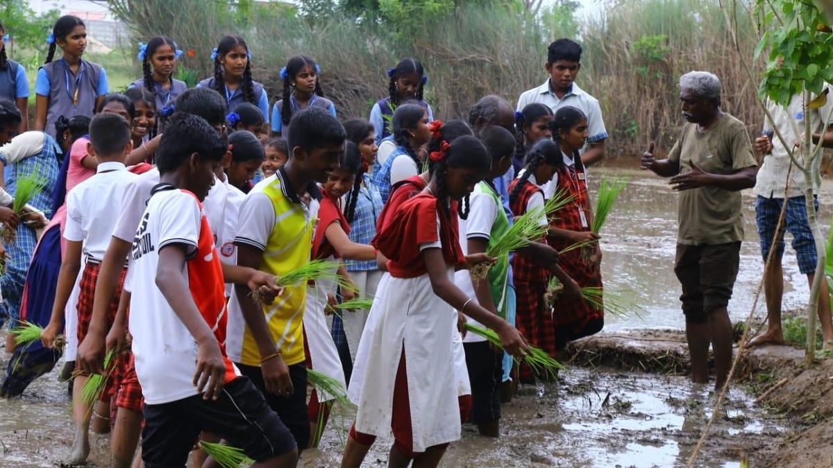 Students learn how to plant paddy saplings at GREENS Biodiversity Sanctuary in Kolarpatti, Tiruchi.