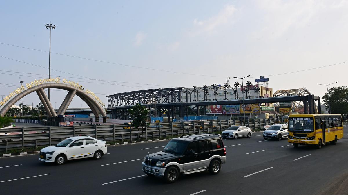 The construction of one portion of the skywalk from the bus bay of the MTC at the Kilambakkam bus terminus over the GST Road is under progress with the girder fixed above the GST Road on the west side of the bus terminus.