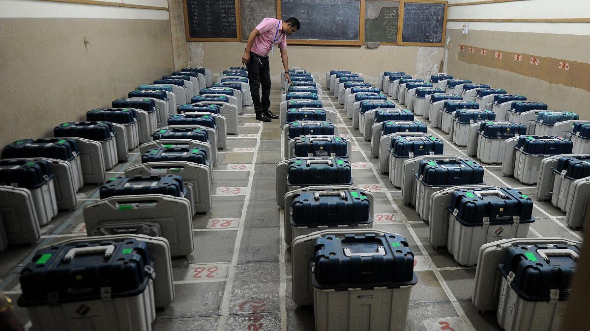 An official checks EVM and VVPAT machines prior to dispatch at an election centre in Ahmedabad. File photo